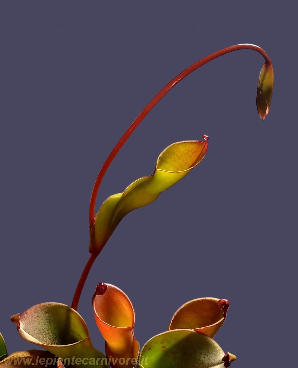 La mia Heliamphora heterodoxa × H. ionasii ha deciso di stupirmi: sullo stesso stelo floreale (quello che normalmente porta i fiori) sono comparsi una gemma fiorale e un piccolo ascidio, cioè una vera e propria foglia carnivora.