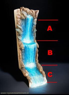 La cascata tripartita è una soluzione scenografica e funzionale che riproduce, in scala ridotta, il comportamento naturale dell’acqua in ambiente tropicale. È composta da tre sezioni distinte: A un tratto in cui l’acqua scorre dolcemente lungo la parete, creando un effetto di umidità diffusa. B un salto centrale, dove l’acqua forma una vera e propria cascata. C un tratto di raccolta e deflusso, in cui l’acqua si riversa nel torrente o bacino alla base.