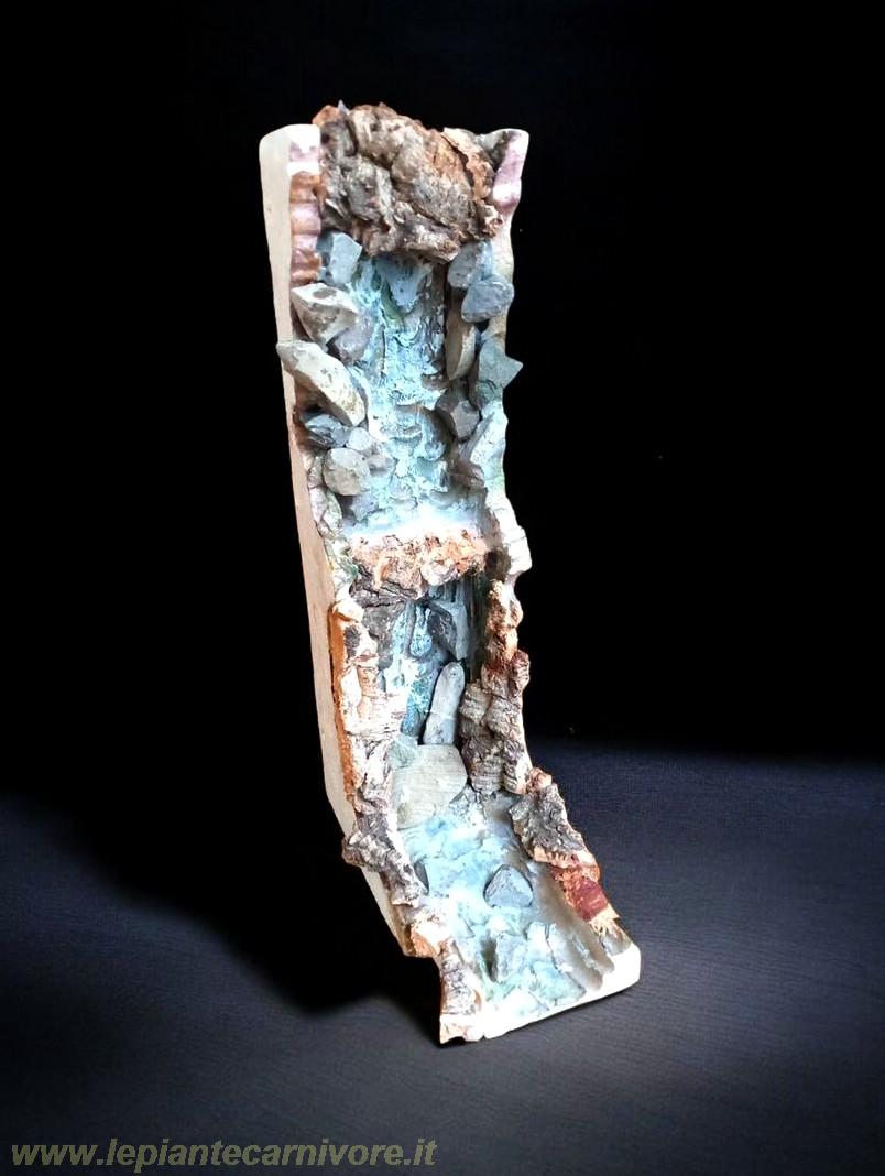Questa struttura permette di ricreare un micro-ambiente equilibrato, con livelli di umidità, movimento d’aria e suoni naturali simili a quelli di un habitat tropicale. Oltre all’effetto estetico e naturale, la cascata tripartita contribuisce a: 1 Mantenere costante l’umidità interna, fondamentale per piante tropicali, anfibi e rettili. 2 Favorire la circolazione dell’aria e la termoregolazione del microclima. 3 Stimolare il comportamento naturale degli animali, offrendo punti d’acqua e micro-habitat. 4 Aumentare l’ossigenazione dell’acqua nel bacino o torrente inferiore. Una cascata di questo tipo non è solo quindi un elemento decorativo: è un componente tecnico-ecologico che rende il terrario un ecosistema più stabile, realistico e sano. Ecco un dettagliato progetto per realizzare una cascata di questo tipo. Primo tratto: acqua che scende aderente alla parete verticale. Secondo tratto: piccola “terrazza” da cui l’acqua salta via dalla parete e cade a qualche cm di distanza, formando una cascatella. A valle ? l’acqua confluisce in un piccolo corso d’acqua che si getto poi in un laghetto. Primo tratto: Creare la parete verticale. Modelliamo con schiuma espansa o lastre di poliuretano la prima parte della cascata, colorandola e ricoprendola sui lati con piccoli sassi che fungono da roccia. lLa superficie dove l’acqua deve aderire deve essere liscia e leggermente concava (non ruvida), così il flusso resta attaccato per effetto della tensione superficiale. Trucco: inclina la parete di 5–10° all’indietro (cioè verso la parete del terrario), questo favorisce l’adesione del film d’acqua. Facciamo terminare il tubo della pompa nella parte alta della parete, lasciando uscire l’acqua in modo che si distribuisca a ventaglio. Possiamo creare una piccola vaschetta o scanalatura (1–2 cm di profondità) alla sommità da cui l’acqua trabocca lentamente sulla parete. Evitiamo getti diretti: un flusso troppo forte rompe l’effetto “a velo”. Test: se l’acqua si stacca, lisciamo ulteriormente la superficie o riduciamo leggermente il flusso della pompa. Secondo tratto: La terrazza e la cascatella. Dopo qualche cm, creiamo una piccola terrazza orizzontale (tipo roccia piatta o scalino). L’orlo frontale della terrazza deve avere un bordino sottile e netto, così l’acqua si stacca e cade in avanti. Incliniamo leggermente la terrazza verso l’esterno (2–3°), ottenendo così una cascatella distaccata di circa 2 cm dalla parete. Materiali ideali per la terrazza: Una pietra piatta (ardesia, lavica) incollata con silicone, oppure un bordo modellato in schiuma e ricoperto di resina e sabbia per simulare la roccia. Terza parte: Raccolta e torrente. Posizioniamo alla base una piccola vasca o canale con ciottoli e sabbia per raccogliere l’acqua. Da lì, l’acqua può così fluire in un torrente artificiale verso un laghetto o nel contenitore che raccoglie l'acqua e dove è presente la pompa per chiudere il ciclo. Ottimizzazione del flusso. Se l’acqua si disperde o schizzi troppo: Riduciamo leggermente la portata della pompa. Aggiungiamo un micro filtro in spugna sull’uscita per uniformare il getto. Controlliamo che la terrazza non abbia micro gocce che fanno da “ponte” con la parete (queste fanno aderire l’acqua invece di farla saltare). Consiglio estetico Per un effetto naturale, lasciamo che un po’ di muschio o radici epifite colonizzino i bordi umidi, questo renderà la transizione tra i due tratti più morbida e realistica. Ecco la nostra cascata tripartita a progetto terminato.