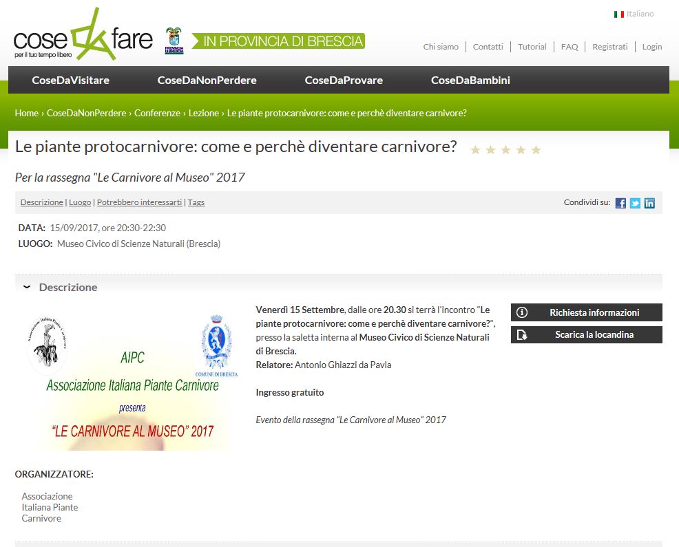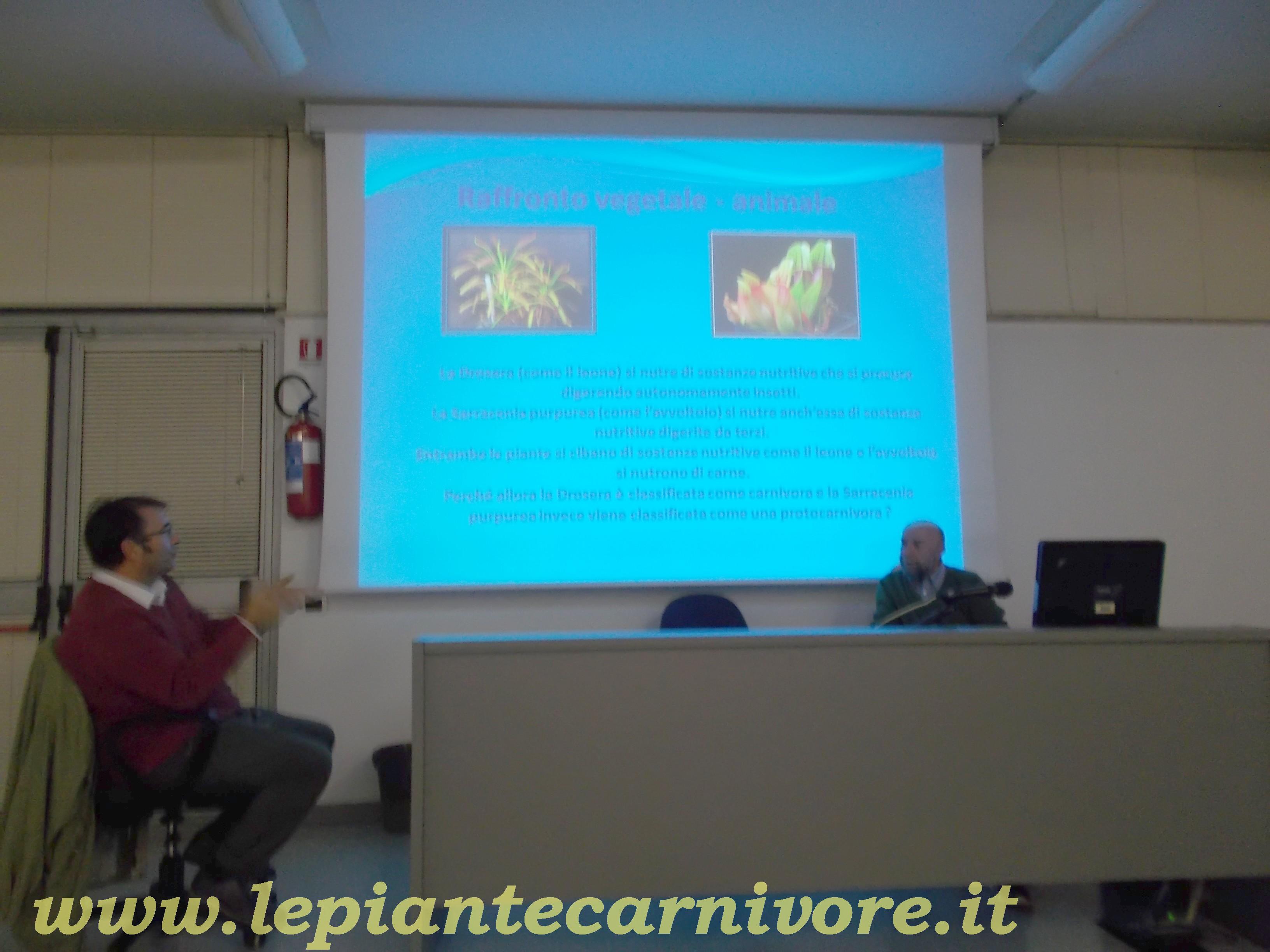Roberto Espen, uno dei maggiori promotori di questa interessante iniziativa, mi ha contattato, chiedendomi se anche per quest'anno, volevo partecipare come oratore ad uno degli incontri previsti. Come potevo rinunciare, vista la bella esperienza dell'anno prima? Dopo una lunga preparazione all'evento, eccoci all'interno della sala del Museo di scienze naturali di Brescia. Dopo una breve introduzione di Roberto Espen, ho iniziato l'esposizione del tema della serata: "Le piante protocarnivore: come e perche' diventare carnivore?" Anche in questa occasione è' stata senza ombra di dubbio un'esperienza indimenticabile, coadiuvata come al solito dalla famigliarità e dalla serietà da chi per anni, organizza eventi carnivori di questo livello. E' doveroso da parte mia ringraziare oltre a Roberto Espens per la sua indubbia simpatia, anche Marco Oliosi per l'ospitalità, Alessandro Ferri per le riprese e tutti quelli che hanno contribuito alla riuscita della serata... non per ultimo il pubblico che ha seguito con interesse l'intera esposizione. Segue il filmato dell'incontro per gentile concessione di Alessandro Ferri.