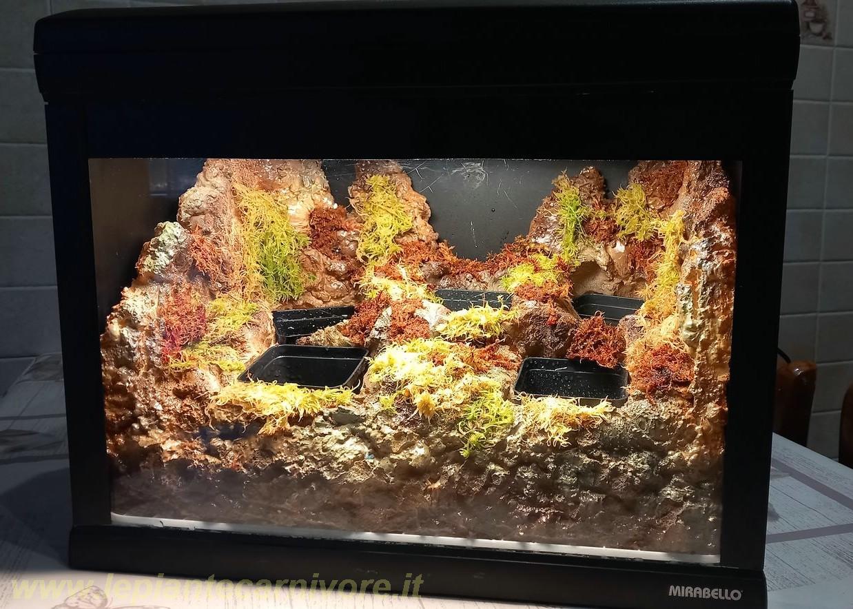 Su richiesta degli admin e dei moderatori del gruppo Piante Carnivore Community, di cui ho l’onore di far parte, mi è stato commissionato la realizzazione di un terrario "Basic" pensato appositamente per i neofiti. Questo terrario sarà messo all'asta durante il II° meeting del gruppo, che si terrà a Corte Franca il prossimo 27-28 Settembre. L’obiettivo è offrire un punto di partenza semplice ma curato per chi si sta avvicinando al mondo delle piante carnivore, con un setup adatto a ospitare specie robuste e facili da gestire. È stato un piacere mettermi all’opera per contribuire a questo evento speciale e spero che il terrario possa trovare casa presso qualcuno che condivida la nostra stessa passione. Terrario trasformato da un acquario con dimensioni: larghezza 40 cm., profondità 25 cm., altezza 30 cm. Tipologia a struttura con sfondo 3D (parziale) sui tre lati, su sfondo nero. Intercapedine sul fondo per raccolta acqua in eccesso. Predisposizione tubo rigido per recupero acqua sul fondo. Alloggio per cinque vasi 7 x 7 cm. removibili. Illuminazione con Visi-Lux Sun, da 11 Watt, 900 Lumen, 4.300 K° Seguono immagini di alcune fasi della preparazione del terrario.