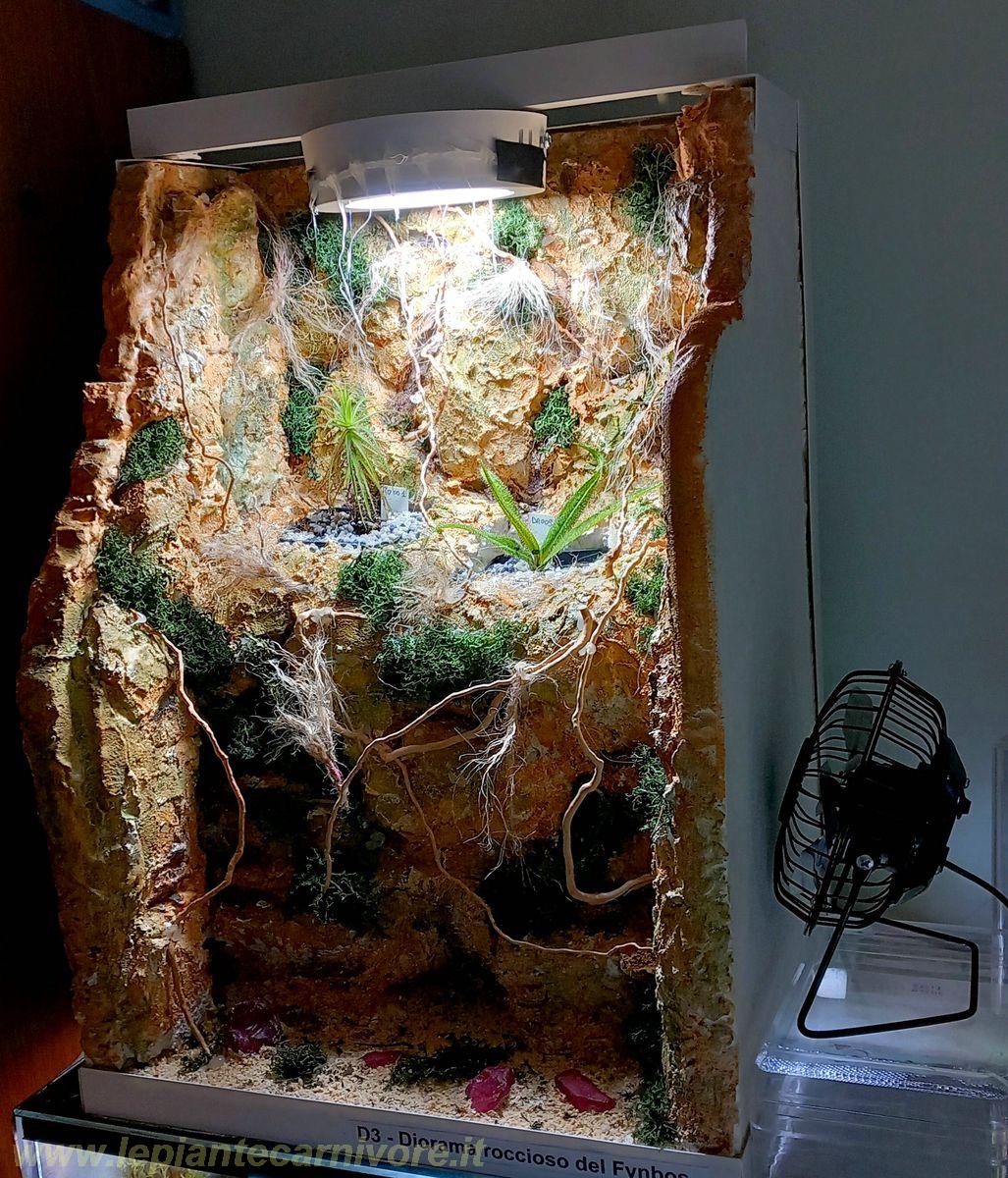 Per rifinire le bordature esterne del diorama utilizzeremo dei profili angolari in plastica a “L”, applicandoli lungo tutto il perimetro visibile della struttura. I profili verranno posizionati sui bordi superiori, inferiori e laterali, andando a coprire e proteggere gli spigoli del polistirolo e del rivestimento in gesso. Questa soluzione ha una duplice funzione: da un lato migliora l’estetica finale del diorama, conferendo un aspetto più pulito e ordinato, dall’altro aumenta la resistenza dei bordi nel tempo, riducendo il rischio di scheggiature o danneggiamenti durante la movimentazione e la manutenzione. I profili fungeranno inoltre da cornice discreta, definendo visivamente i limiti della scena senza interferire con l’ambientazione naturale interna. Illuminazione L'habitat del Fynbos è caratterizzato da una luce molto intensa, di conseguenza il nostro diorama richiederà forte luminosità ma senza stress eccessivo da calore diretto. Tipo di lampada consigliato Le opzioni migliori sono: Lampade LED 4000–6500 K° : luce stile “sole africano” che mantiene inoltre i colori del diorama molto naturali. Intensità lumen totali: 2000–4000 lumen per un’area di 30–40 cm Distanza corretta dalle piante 15–20 cm dalla cima delle piante mantengono un effetto “sole” senza scottature. Nel Fynbos la luce è solitamente molto prolungata per tanto durante il periodo estivo l'ottimale sarebbe 12-14 ore di luce, mentre per il periodo invernale 10-12 ore. Test finale per verificare la ventilazione Prima di introdurre le piante nelle nicchie a loro dedicate, è fondamentale testare accuratamente il movimento dell’aria. Come già ribadito più volte, un flusso adeguato garantisce che le piante non subiscano ristagni umidi né surriscaldamenti, condizioni che potrebbero comprometterne la salute. Di seguito i passaggi dettagliati per eseguire un test professionale. Accendiamo il LED e la ventola (senza le piante) Questo passaggio permette di capire come si muove l’aria nei pressi della nicchia, se ci sono zone “calde” e/o esistono angoli senza movimento d’aria. Lascia il sistema acceso almeno 15–20 minuti, il tempo necessario perché si stabilizzino temperatura e circolazione. Monitoraggio del flusso d’aria – bandierine in colla a caldo Per verificare che l’aria all’interno del diorama si muova in modo delicato e uniforme, possiamo realizzare delle micro-bandierine estremamente leggere utilizzando fili di colla a caldo, sfruttando una caratteristica naturale di questo materiale. Stendiamo una striscia sottile di colla a caldo su una superficie liscia (come plastica o vetro), che fungerà da punto di ancoraggio. Quando la colla è ancora calda, con l’aiuto di uno stuzzicadenti o di un bastoncino tocchiamo leggermente la striscia e tiriamola verso il basso con un movimento lento e continuo. In questo modo la colla si allunga formando fili sottilissimi, simili a capelli, che rimangono collegati alla striscia superiore. Ripetiamo l’operazione in più punti della stessa striscia e otterremo un piccolo gruppo di fili pendenti, estremamente sensibili anche a minimi spostamenti d’aria. Una volta raffreddati, questi filamenti possono essere posizionati all’interno del diorama, vicino alle piante, per osservare il comportamento del flusso d’aria. Il movimento ideale dei fili non deve essere brusco o costante, ma un leggero ondeggiamento irregolare, segno di una ventilazione diffusa e naturale, simile a una brezza che accarezza le piante e non a un flusso diretto.
