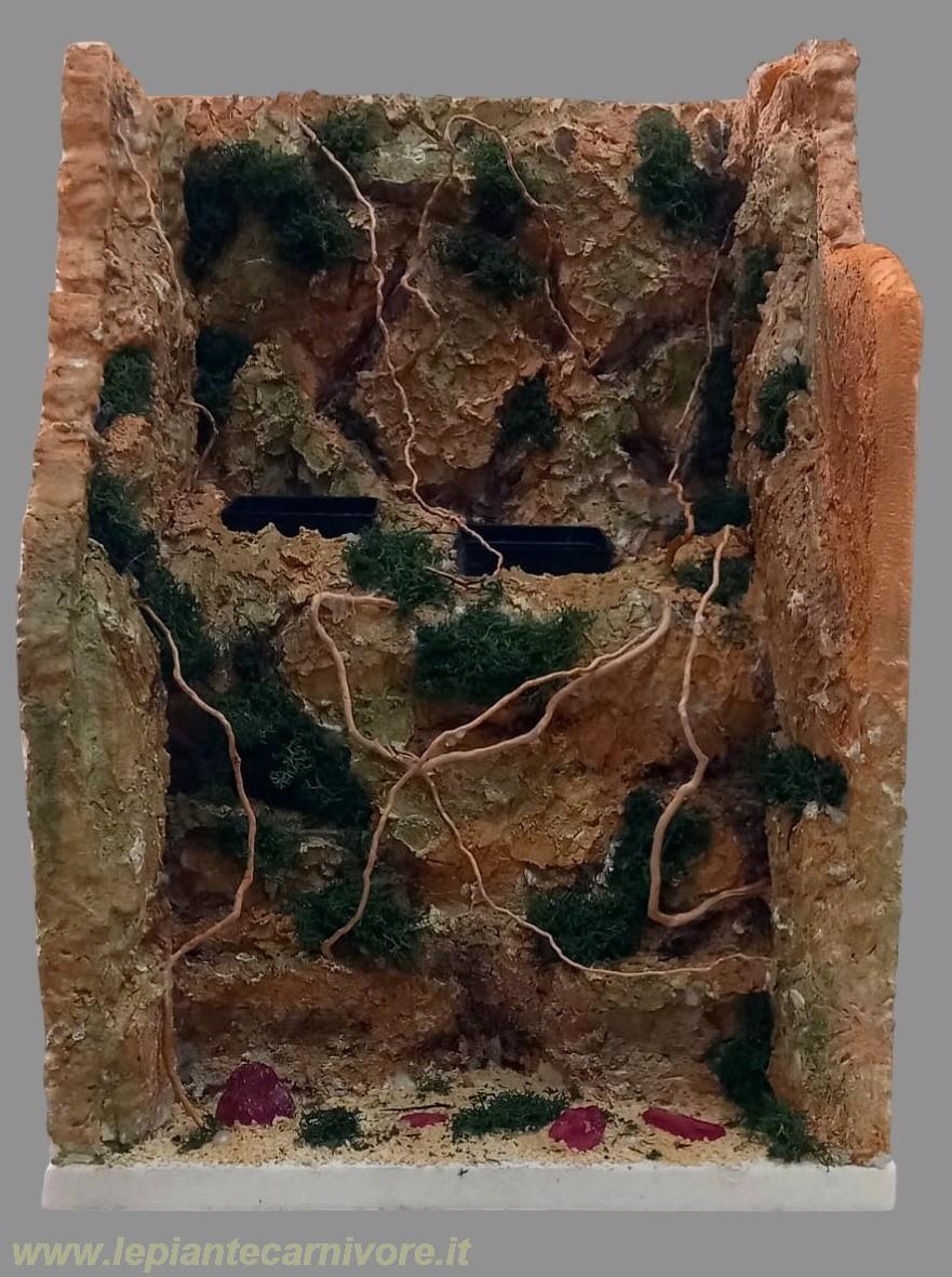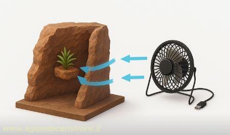 La prima è famosa per il suo approccio unico alla cattura degli insetti, a differenza di molte altre piante carnivore, la Roridula non digerisce direttamente le prede, ma si affida a insetti predatori (come i Pameridea) per ottenere i nutrienti necessari. Questo comportamento particolare rende la coltivazione della Roridula un’esperienza affascinante ma anche delicata. La Drosera regia invece è una pianta che sembra arrivare da un’altra epoca, una creatura elegante e antica che domina il suo piccolo mondo con un fascino quasi mitologico. Quando la si osserva, non si ha di fronte la classica Drosera minuta delle torbiere, ma una vera “regina”, con foglie lunghe e affusolate che possono superare anche il mezzo metro e che si aprono come un ventaglio di lame lucenti. Per coltivare al meglio queste specie, è fondamentale replicare il loro ambiente naturale. Un’idea originale per ospitare queste due particolai piante carnivore, è allestire un diorama aperto, che combina estetica e funzionalità. Questo approccio permette di ricreare visivamente il loro habitat naturale e allo stesso tempo garantisce la corretta circolazione dell’aria, evitando ristagni d’aria che potrebbero danneggiare le piante. Allestire un diorama aperto, non è solo una scelta estetica: permette di rispettare le loro esigenze biologiche, stimola la loro naturale strategia di predazione e rende l’esperienza di coltivazione unica. In questa pagina vedremo come realizzare un semplice ma efficace diorama per coltivare queste particolarissime piante. La parte più importante nella realizzazione di questo diorama, è la gestione della ventilazione. Progettazione della ventilazione. Come accennato in precedenza, in natura queste piante crescono in ambienti aperti, arieggiati e soggetti a una costante circolazione dell’aria, questa movimentazione atmosferica svolge diverse funzioni vitali: ° Previene l’eccesso di umidità stagnante, che può favorire muffe e funghi. ° Favorisce la traspirazione naturale delle foglie, evitando che la piante rimangano troppo bagnate. ° Aiuta a dissipare il calore, utile soprattutto se il diorama è illuminato con lampade potenti. ° Migliora la qualità dell’aria intorno alla piante, mantenendo condizioni più vicine a quelle del loro habitat naturale. Per questo motivo, anche in un diorama aperto, garantire una corretta ventilazione è fondamentale per simulare un ambiente realistico e sano, non diretta ma indiretta. Perché la ventilazione non deve essere diretta La tentazione iniziale potrebbe essere quella di puntare una ventola direttamente verso le piante, tuttavia, questo tipo di ventilazione è dannoso sia per la Roridula che per la Drosera rega. Un flusso d’aria diretto provoca infatti: ° Disidratazione accelerata delle foglie, che possono perdere troppo rapidamente acqua. ° Danneggiamento delle gocce resinose, fondamentali per la cattura delle prede. ° Stress meccanico, con foglie che si muovono continuamente e consumano energia inutilmente. Microclima non naturale, troppo turbolento e secco. In breve: piante delicata come la Roridula e la Droseraregia necessitano di vento, sì, ma simile a una brezza, non a una corrente forzata. Vantaggi di una ventilazione indiretta Una ventilazione indiretta è la soluzione ideale per ottenere il giusto equilibrio. L’aria non viene sparata contro la piante, ma fatta scorrere nell’ambiente, distribuendosi in modo uniforme. I principali vantaggi sono: ° Movimento dell’aria morbido e diffuso, molto più simile a quello naturale. ° Riduzione completa del rischio di disidratazione delle foglie. ° Ottima prevenzione contro muffe e ristagni, ma senza turbolenze. ° Benessere generale delle piante, che vivono in un microclima stabile e naturale. La soluzione scelta per il diorama: ventilazione a parete indiretta Per ottenere questo tipo di aerazione controllata, la ventilazione del diorama verrà generata tramite una ventola posizionata esternamente. Il sistema funzionerà in questo modo: ° La ventola aspira l’aria fresca dall’esterno. ° L’aria viene soffiata contro la parete laterale esterna del diorama, e non direttamente verso le piante. ° Scorrendo lungo la parete, il flusso si distribuisce uniformemente. ° Grazie al bordo arrotondato della parete del diorama, l’aria “scivola” e si spalma dolcemente verso l’interno, entrando come una brezza soffusa. ° Le piante ricevono così un movimento d’aria leggero e naturale, senza turbolenze né getti diretti. L'immagine che segue illustra perfettamente questo concetto: l’aria colpisce la parete, segue il bordo arrotondato e viene guidata verso le piante in modo graduale.