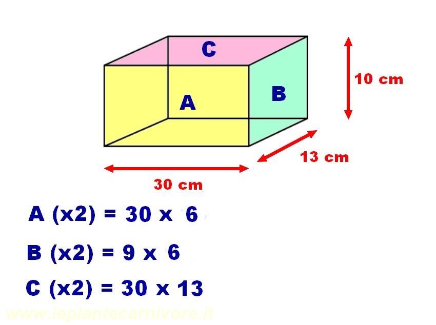 Come creare la nicchia per la Roridula e per la Drosera regia. Poiché questo diorama non è un terrario chiuso ricavato da un acquario, non possiamo creare sul fondo una intercapedine per raccogliere l’acqua in eccesso che scola dai vasi dopo le bagnature. Per risolvere il problema, realizzeremo quindi uno spazio nascosto sotto i vasi, in cui inserire un vaschetta che fungerà da vaschetta di raccolta. Useremo dei ritagli di polistirene estruso per costruire un parallelepipedo cavo, che appoggeremo direttamente sulla base del diorama. Le sue facce più strette saranno rivolte verso le due pareti laterali, mentre una delle due facce più ampia sarà a contatto con la base del diorama e l’altra contro la parete di fondo. Tenendo conto delle misure del diorama e di quelle delle nicchie per le piante che vedremo più avanti, il nostro parallelepipede sarà così pianificato.