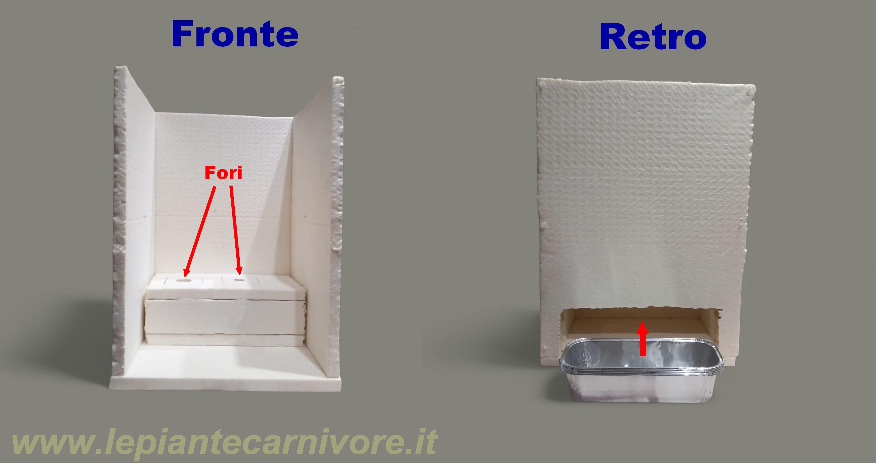 Sopra al parallelepipedo realizziamo due nicchie che saranno posizionati a livelli diversi: quella per la Roridula, sarà posta 2–3 cm più in alto rispetto a quella della Drosera regia. Queste misure devono essere calcolate tenendo conto dell'altezza del parallelepipedo e dei vasi che contengono le piante. Per quanto riguarda la distanza orizzontale dalle pareti laterali, la nicchia per la Drosera regia dovrà trovarsi a 14–17 cm dalla parete vicino alla ventola, mentre quella per la Roridula dovrà essere a 18–22 cm dalla stessa parete.