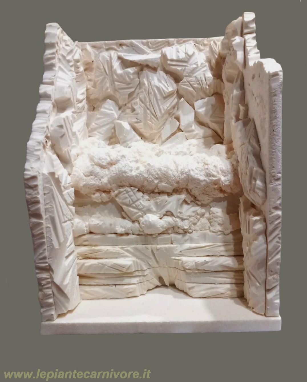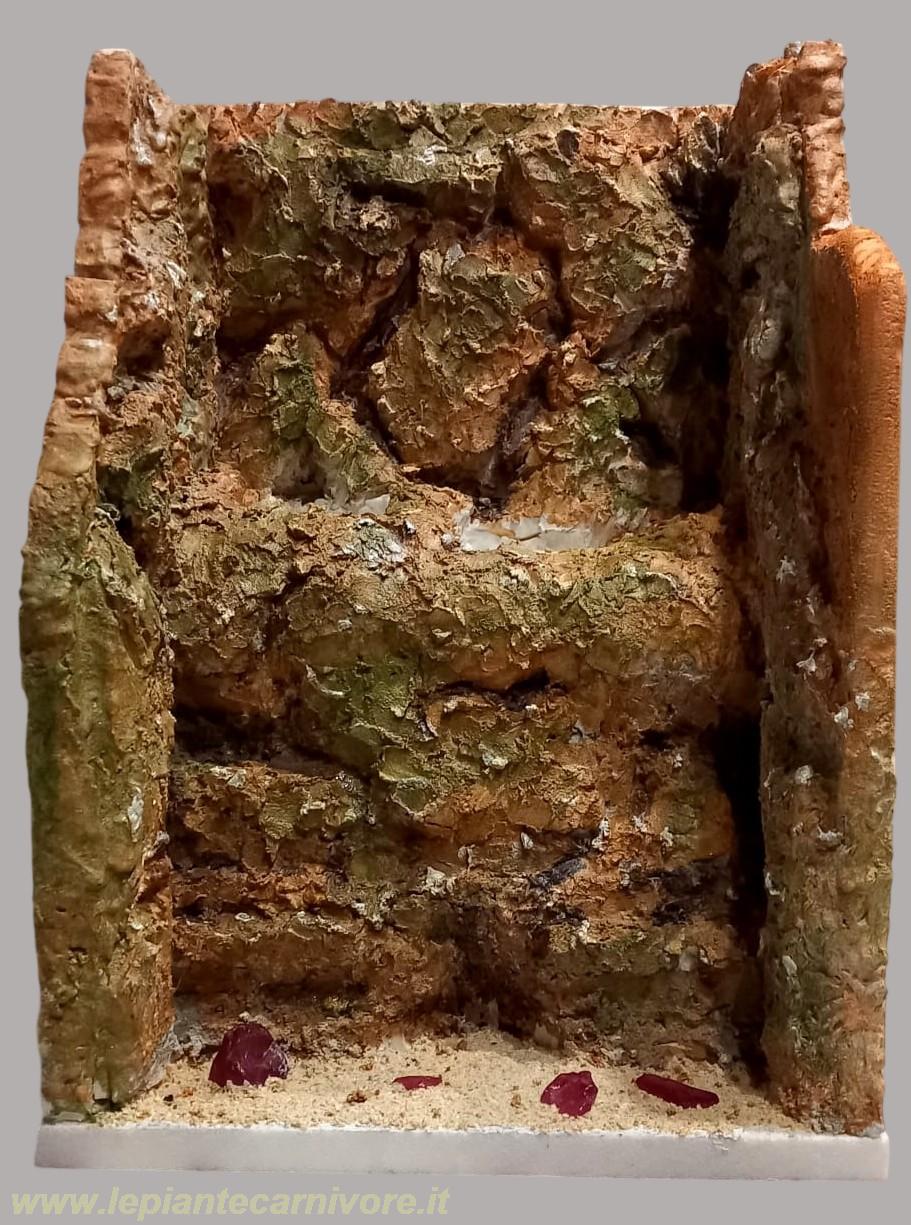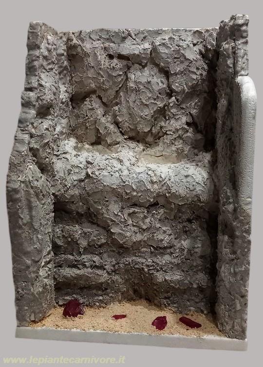 Una volta completata la struttura, ricopriamo le parti ancora libere delle pareti, il parallelepipedo e le due nicchie, con altri blocchi di polistirolo. Sagomiamo i vari blocchi con un cutter per creare rocce, sporgenze, gradini e piccole cavità, dando così al diorama un aspetto naturale e armonioso. Questo sistema unisce funzionalità e realismo, mantenendo il drenaggio efficiente, l’aspetto naturale del Fynbos e la facilità di manutenzione dell’acqua in eccesso.