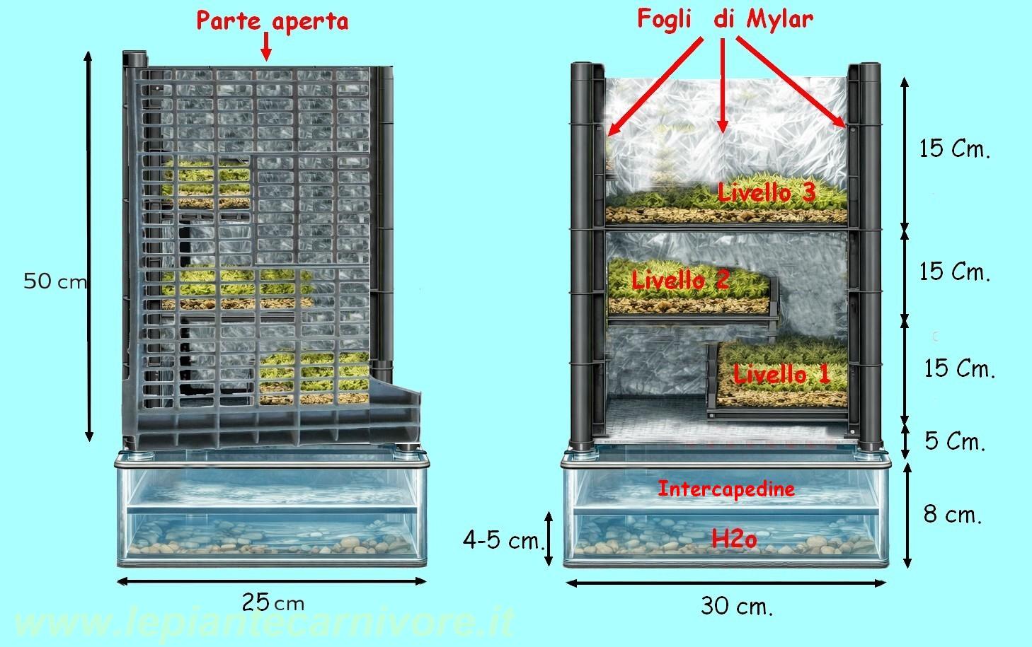 Non si tratta di una sfagnera tradizionale né di un contenitore irrigato, ma di un micro–ecosistema costruito per funzionare senza bagnature dirette, senza saturazioni e senza interventi continui, sfruttando processi fisici naturali come evaporazione, diffusione del vapore e stratificazione dell’umidità. Il concetto di "Luce rubata" è centrale in questo tipo di sistema, con questa espressione si intende una luce indiretta, non dedicata e non necessariamente prodotta da una sorgente installata appositamente sopra la sfagnera. La luce che alimenta la Sfagnera a "Luce diretta" non proviene infatti da una sorgente dedicata posta frontalmente o superiormente, ma può essere efficacemente “intercettata” da fonti luminose indipendenti già presenti nell’ambiente circostante. Lampade utilizzate per altri terrari, illuminazioni ambientali della stanza o punti luce collocati nelle immediate vicinanze diventano, di fatto, sorgenti luminose secondarie che contribuiscono al bilancio energetico del sistema. Affinché questa luce dispersa non venga semplicemente assorbita o dispersa nello spazio, l’interno della struttura viene rivestito con fogli di Mylar riflettente. Il Mylar è un film polimerico a base di polietilene tereftalato (PET) metallizzato, caratterizzato da un’elevata capacità di riflessione speculare, con valori che possono superare il 95% della luce incidente. A differenza di superfici opache o metalliche comuni, il Mylar non assorbe quantità significative di energia luminosa e non la trasforma in calore: la luce viene riflessa quasi integralmente e mantenuta all’interno del volume coltivativo. Quando la luce proveniente da fonti esterne entra nella cassetta, anche in modo laterale o indiretto, colpisce le superfici rivestite in Mylar e viene immediatamente riflessa più volte. Questo processo genera una diffusione interna che aumenta la probabilità che i fotoni raggiungano le superfici vegetali, anche in assenza di un’irradiazione diretta. La luce non segue più un’unica direzione lineare, ma viene “rimbalzata” all’interno della struttura, creando un campo luminoso più omogeneo e persistente. Il risultato non è un aumento artificiale dell’intensità luminosa, ma un miglioramento drastico dell’efficienza luminosa: la stessa quantità di luce disponibile nell’ambiente viene utilizzata più volte prima di uscire dal sistema, in pratica, il Mylar trasforma una luce ambientale diffusa e potenzialmente inefficace in una risorsa sfruttabile per la fotosintesi dello Sfagno. Questo meccanismo è particolarmente efficace in una sfagnera a sviluppo verticale e a livelli, dove la luce tende naturalmente a favorire gli strati superiori. La riflessione sulle pareti laterali e sul fondo consente alla luce di raggiungere anche i livelli inferiori e intermedi, compensando le ombre generate dalla struttura stessa e dalla vegetazione sovrastante. In questo modo, ogni livello coltivativo riceve una quota di illuminazione coerente con le proprie esigenze ecologiche, senza la necessità di inserire corpi illuminanti dedicati all’interno del sistema. In sintesi, il Mylar non è un semplice rivestimento, ma un vero e proprio elemento funzionale del progetto: intercetta la luce “rubata” dall’ambiente, la riflette, la redistribuisce e la indirizza verso lo Sfagno, trasformando un’illuminazione indiretta in una condizione luminosa biologicamente efficace e stabile nel tempo. Dal punto di vista costruttivo, la Sfagnera a "Luce diretta" è inoltre organizzata attorno a un sistema idrico passivo che genera umidità dal basso verso l’alto. Alla base della sfagnera è presente un comparto inferiore dedicato esclusivamente alla gestione dell’acqua e dell’umidità. Questo comparto è costituito da una vaschetta contenente acqua libera, posizionata sotto il volume coltivativo e separata da esso da uno spazio d’aria ben definito. La vaschetta non ha funzione irrigua, ma agisce come una massa evaporante stabile, capace di fornire umidità al sistema in modo continuo e passivo. La caratteristica fondamentale di questo comparto è la chiusura laterale sui quattro lati, che trasforma la vaschetta e lo spazio sovrastante in una sorta di camera igrometrica controllata. Le pareti laterali impediscono la dispersione orizzontale del vapore acqueo, costringendo l’umidità generata dall’evaporazione a muoversi prevalentemente in direzione verticale. In questo modo il vapore non si disperde nell’ambiente circostante, ma viene trattenuto e guidato verso l’alto, dove alimenta gradualmente i livelli coltivativi. Sopra la vaschetta si sviluppa l’intercapedine, uno spazio d’aria permanente che non contiene né substrato né materiale vegetale, questa intercapedine rappresenta una zona di transizione fisica e funzionale tra l’acqua libera e il sistema biologico. Qui l’aria si arricchisce di vapore acqueo, raggiungendo condizioni di elevata umidità senza però diventare satura in modo statico. La presenza delle pareti laterali chiuse contribuisce a mantenere questo micro-ambiente stabile, riducendo le fluttuazioni legate all’umidità ambientale esterna. L’intercapedine non è un volume isolato in senso ermetico: la sua apertura superiore consente all’aria umida di risalire lentamente verso i livelli coltivativi, mentre eventuali micro-scambi laterali impediscono la formazione di ristagni. Il risultato è un flusso verticale lento e continuo, paragonabile a un effetto camino a bassa intensità, che trasporta umidità in modo uniforme e controllato. Dal punto di vista funzionale, la chiusura laterale della vaschetta e dell’intercapedine crea un plenum igrometrico inferiore, una riserva di aria umida che alimenta il sistema dall’interno. Questo plenum stabilizza il gradiente di umidità lungo l’asse verticale della Sfagnera, rendendo prevedibile e ripetibile la distribuzione dell’umidità nei vari livelli. I livelli inferiori ricevono aria costantemente um