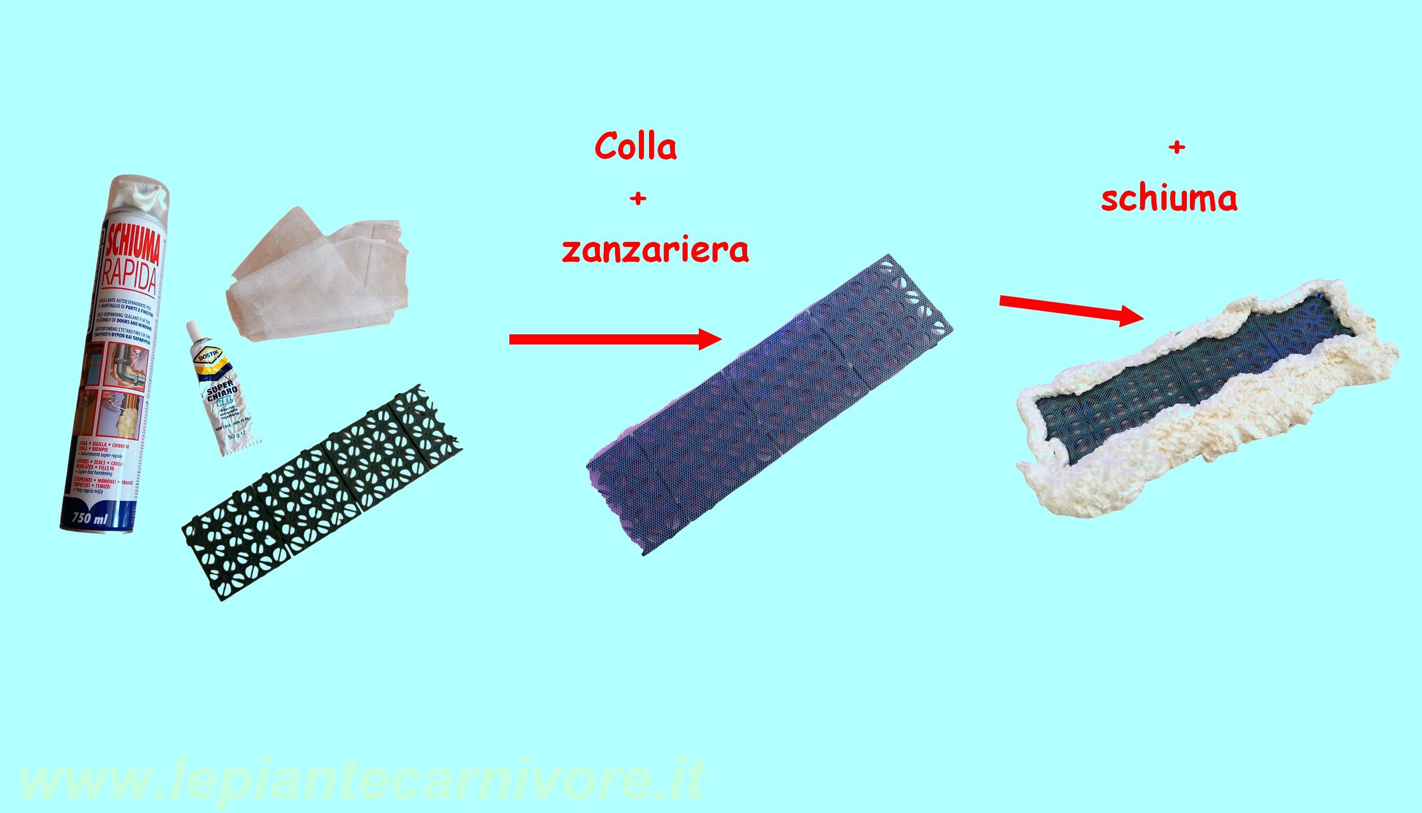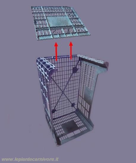 Questa intercapedine non contiene substrato né materiale vegetale ed è concepita come una vera e propria camera tecnica, destinata ad accogliere l’aria umidificata prodotta dall’evaporazione dell’acqua sottostante. La distanza tra il livello dell’acqua e il primo piano coltivativo viene mantenuta sufficiente a garantire la presenza di aria libera, evitando qualsiasi possibilità di contatto diretto o risalita incontrollata. L’intercapedine, chiusa lateralmente dalle pareti della cassetta rivestite in materiale riflettente, concentra il vapore acqueo e ne limita la dispersione orizzontale, favorendo una risalita lenta e uniforme verso l’alto. In questo spazio l’aria si carica di umidità senza diventare stagnante, creando una riserva igrometrica stabile che alimenta progressivamente i livelli superiori. La funzione dell’intercapedine è quindi quella di trasformare l’acqua contenuta nella vaschetta in umidità atmosferica controllata, stabilendo la base del gradiente igrometrico su cui si sviluppa l’intera Sfagnera a "Luce rubata". Una volta definita l’intercapedine, procediamo con il posizionamento della prima griglia di supporto, che segna il passaggio tra il comparto tecnico inferiore e l’area coltivativa vera e propria. A questo scopo viene utilizzata una griglia modulare in plastica alveolare, collocata in posizione orizzontale a una distanza di 18 cm. dalla base della cassetta, così da chiudere superiormente l’intercapedine e creare una superficie di appoggio stabile per il primo livello coltivativo. La struttura tridimensionale e alveolare della griglia consente il libero passaggio dell’aria umida proveniente dal basso, favorendo la risalita del vapore senza ostacoli. Per evitare la dispersione del substrato attraverso le maglie della griglia, rivestiamo completamente la sua superficie con un tessuto a maglia fine, come una zanzariera in materiale plastico, che svolge una funzione filtrante pur mantenendo un’elevata permeabilità all’aria e all’umidità. Lungo il perimetro della griglia realizziamo un bordo rialzato in schiuma poliuretanica, Questo bordo perimetrale oltre ad “incollare” la griglia alle pareti della cassetta, ha la funzione anche di contenere il substrato all’interno del piano coltivativo, impedendone lo scorrimento laterale e contribuendo alla stabilità del livello nel tempo. In questa configurazione la griglia modulare non agisce come drenaggio, ma come piano strutturale aerato e contenitivo, capace di sostenere il materiale coltivativo senza compromettere la diffusione dell’umidità verso l’alto.