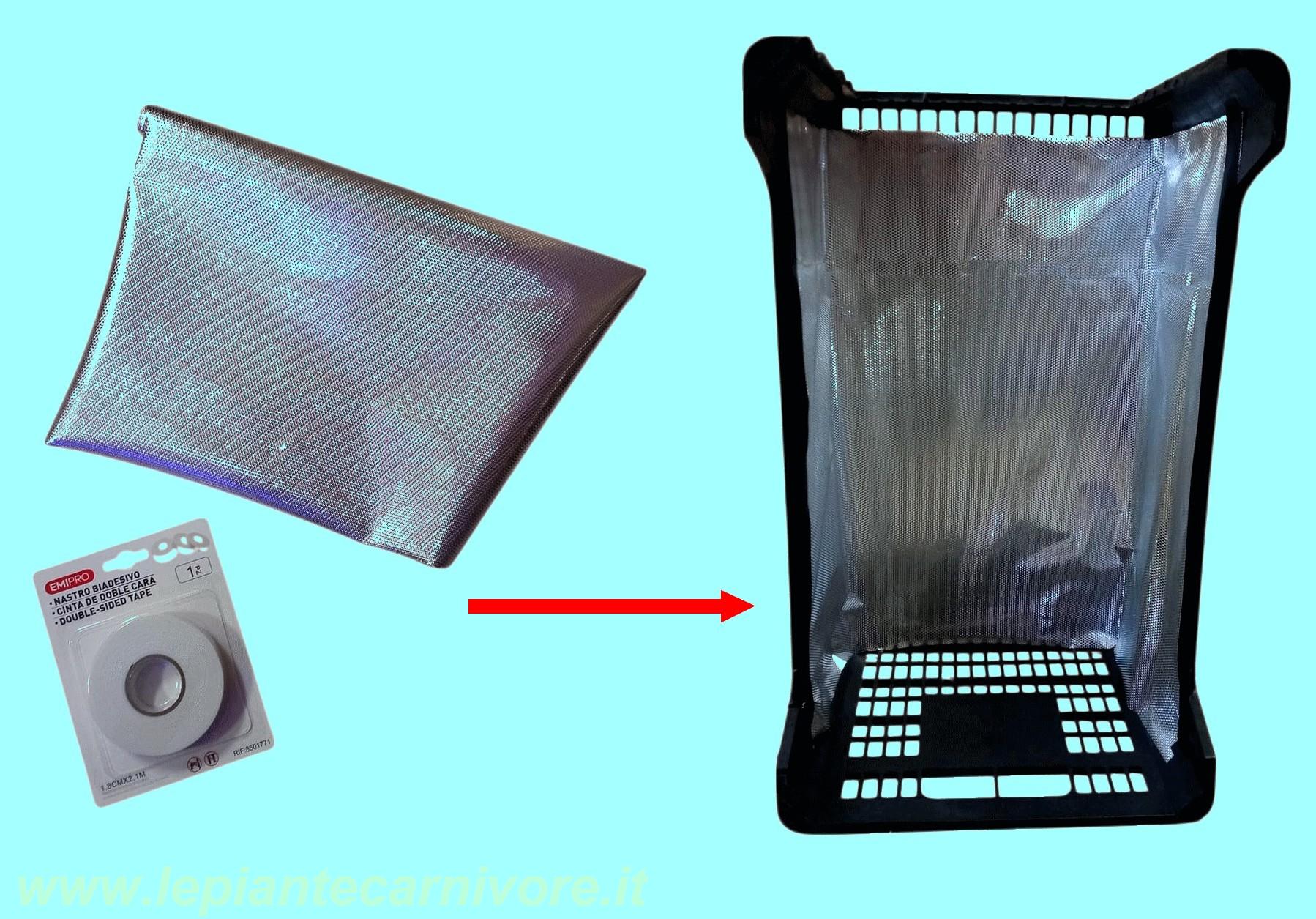 Una volta preparata la struttura portante, passiamo al rivestimento interno della cassetta. Foderiamo le pareti laterali e il fondo con fogli di materiale riflettente, come Mylar, applicati in modo continuo e aderente aiutandoci con del nastro biadesivo. Questo rivestimento ha la funzione di amplificare e ridistribuire la luce proveniente da fonti luminose esterne, indirizzandola verso l’interno della struttura e verso i livelli coltivativi. Come specificato in precedenza, il Mylar, grazie alla sua elevata capacità riflettente e alla superficie liscia, contribuisce inoltre a ridurre l’assorbimento di umidità da parte delle pareti, rendendo l’ambiente interno più stabile dal punto di vista igrometrico. Il rivestimento viene posizionato in modo da coprire completamente il fondo e i lati della cassetta, lasciando libera la parte superiore, che rimane aperta per consentire la risalita dell’umidità e lo scambio d’aria con l’ambiente circostante.
