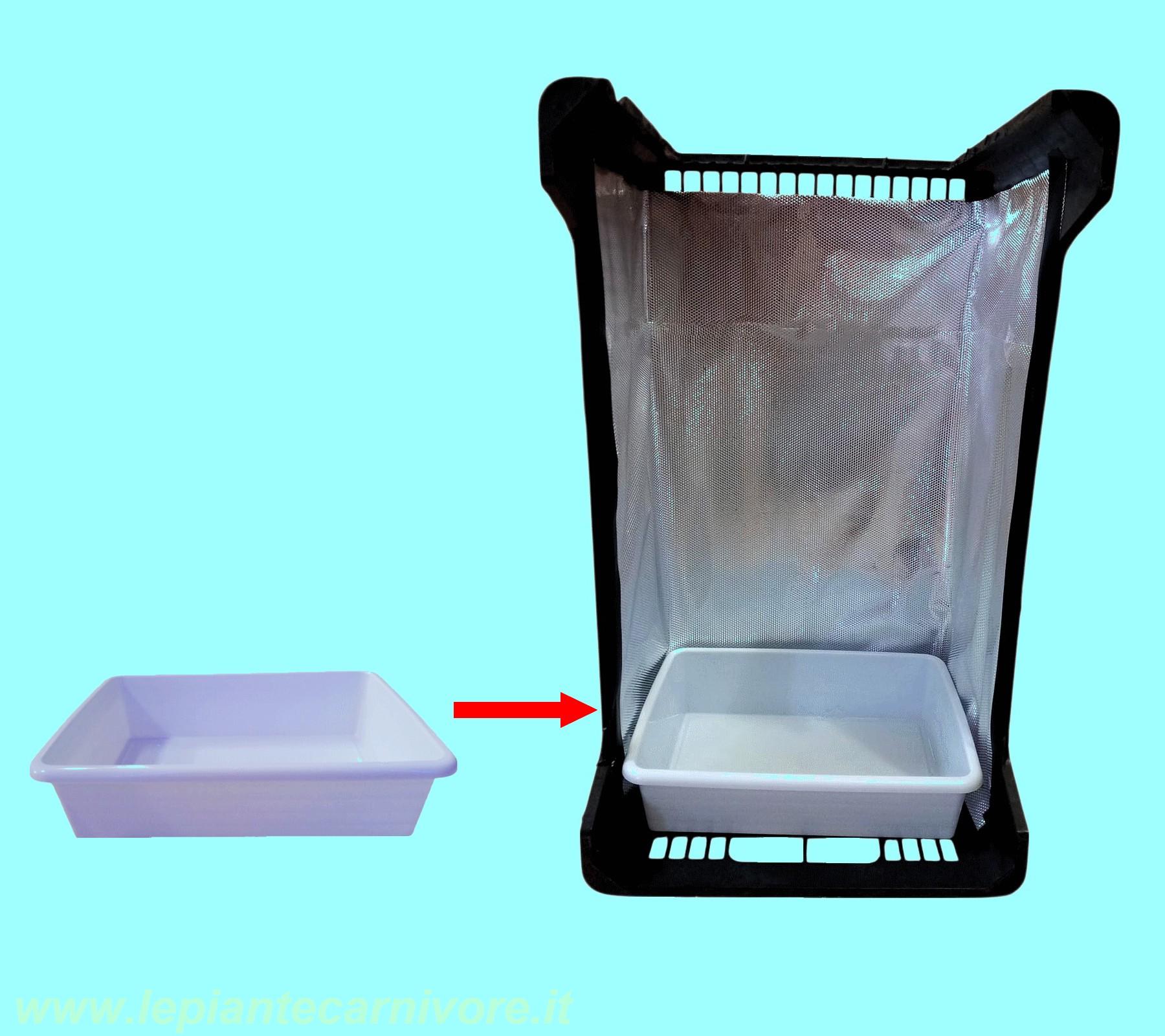 Completato il rivestimento interno, si procederemo con l’inserimento della vaschetta destinata all’accumulo dell’acqua. La vaschetta viene collocata direttamente sul fondo della cassetta, appoggiata in modo stabile e perfettamente orizzontale. Le sue dimensioni saranno tali da occupare un'area pari a quella della superficie inferiore della cassetta ed un'altezza minima per poter contenere 4-5 cm di acqua. In questa configurazione essa occupa quindi la parte più bassa della struttura e diventa l’elemento di base del sistema idrico passivo. La sua funzione non è quella di drenare o irrigare direttamente il substrato, ma di contenere una quantità controllata di acqua libera, destinata a evaporare lentamente nel tempo. La posizione sul fondo consente di sfruttare al massimo l’altezza utile della cassetta e di mantenere il sistema compatto, riducendo dispersioni laterali e facilitando la risalita dell’umidità lungo la colonna coltivativa. Il livello dell’acqua viene mantenuto deliberatamente al di sotto dei piani di coltivazione, in modo che non vi sia mai contatto diretto tra l’acqua e i materiali sovrastanti. In questo assetto la vaschetta agisce come massa evaporante stabile, alimentando l’ambiente interno di umidità senza generare ristagni o saturazioni indesiderate.