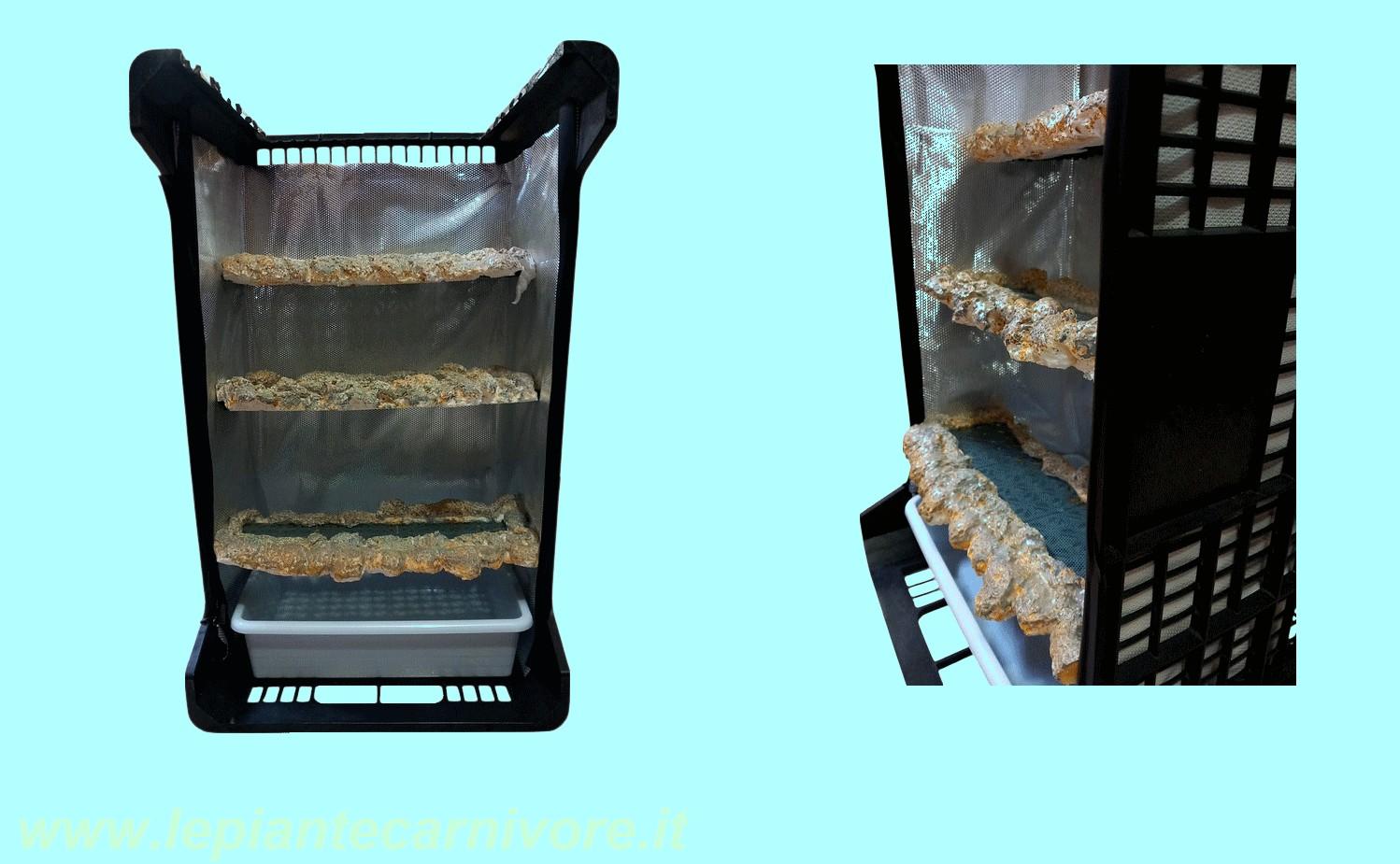 Nello stesso modo, prepariamo una seconda griglia che fisseremo a circa 30 cm. dal fondo della cassetta ed una terza a circa 38 cm. dal fondo della cassetta. Una volta preparate le tre griglie di supporto e completata la realizzazione dei bordi in schiuma poliuretanica, è possibile procedere alla colorazione delle superfici. Nella fase di colorazione delle parti realizzate in schiuma poliuretanica è consigliabile privilegiare l’impiego di colori chiari con finitura opaca o leggermente satinata, così da favorire la riflessione della luce diffusa all’interno della struttura. Tonalità come bianco caldo, avorio, beige chiaro, sabbia, grigio molto chiaro o verde salvia pallido rappresentano un buon compromesso tra resa luminosa ed estetica naturale. Questi colori contribuiscono ad aumentare la luminosità complessiva dei livelli coltivativi e a ridurre la formazione di zone d’ombra, migliorando l’efficienza della luce rubata. Al contrario, colori scuri o molto saturi tendono ad assorbire la luce, mentre superfici lucide producono riflessi speculari poco utili dal punto di vista biologico. La scelta di tonalità chiare e opache consente quindi di ottimizzare la distribuzione luminosa senza interferire con il corretto funzionamento del sistema. La schiuma, una volta completamente asciutta e stabilizzata, può essere colorata utilizzando colori acrilici. Nel posizionare le tre griglie all’interno della struttura è importante procedere con criterio, valutando attentamente la loro disposizione spaziale. Le griglie non devono essere collocate in modo perfettamente sovrapposto, ma leggermente sfalsate o arretrate tra loro, così da evitare la formazione di coni d’ombra tra un livello e l’altro. Questa accortezza consente alla luce riflessa dalle superfici interne di raggiungere in modo più uniforme tutti i livelli coltivativi, riducendo le zone permanentemente in ombra e favorendo una crescita più omogenea dello Sfagno. Nel posizionamento delle tre griglie di coltivazione è consigliabile inoltre mantenerle prevalentemente orizzontali rispetto alla base della cassetta, così da garantire una distribuzione uniforme dell’umidità all’interno del substrato. Per migliorare l’intercettazione della luce rubata proveniente da fonti esterne, le griglie possono tuttavia essere leggermente inclinate in modo funzionale. In questa configurazione il lato posteriore viene mantenuto leggermente più alto, mentre il lato anteriore (frontale) risulta più basso, orientando così la superficie coltivativa verso la principale fonte luminosa. Considerando una profondità reale delle griglie di 10–12 cm, l’inclinazione consigliata è molto contenuta, indicativamente compresa tra 5 e 8 gradi, corrispondente a una differenza di quota di circa 3–5 mm tra il lato posteriore e quello anteriore. Questa micro-inclinazione è sufficiente a migliorare la distribuzione della luce diffusa senza modificare in modo significativo il gradiente di umidità né favorire accumuli d’acqua o zone di eccessiva asciugatura. Nell'immagine che segue a sinistra la struttura con le tre griglie, a destra viene mostrato le tre griglie leggermente sfalsate o arretrate tra loro.